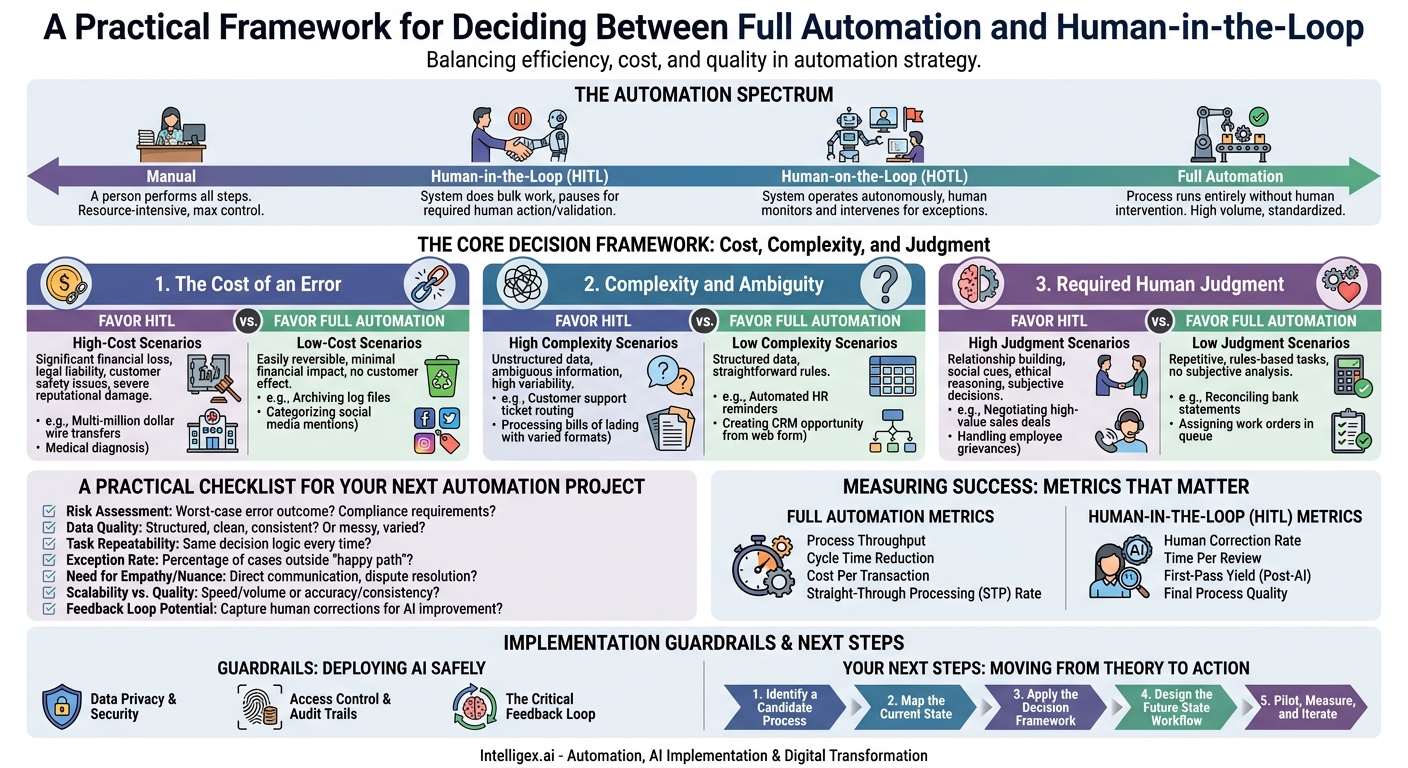 How do you decide where a process should fall on the automation spectrum? Your decision should balance three fundamental factors: the cost of an error, the complexity of the task, and the need for human judgment. By evaluating a process against these three pillars, you can build a strong business case for either HITL or full automation.