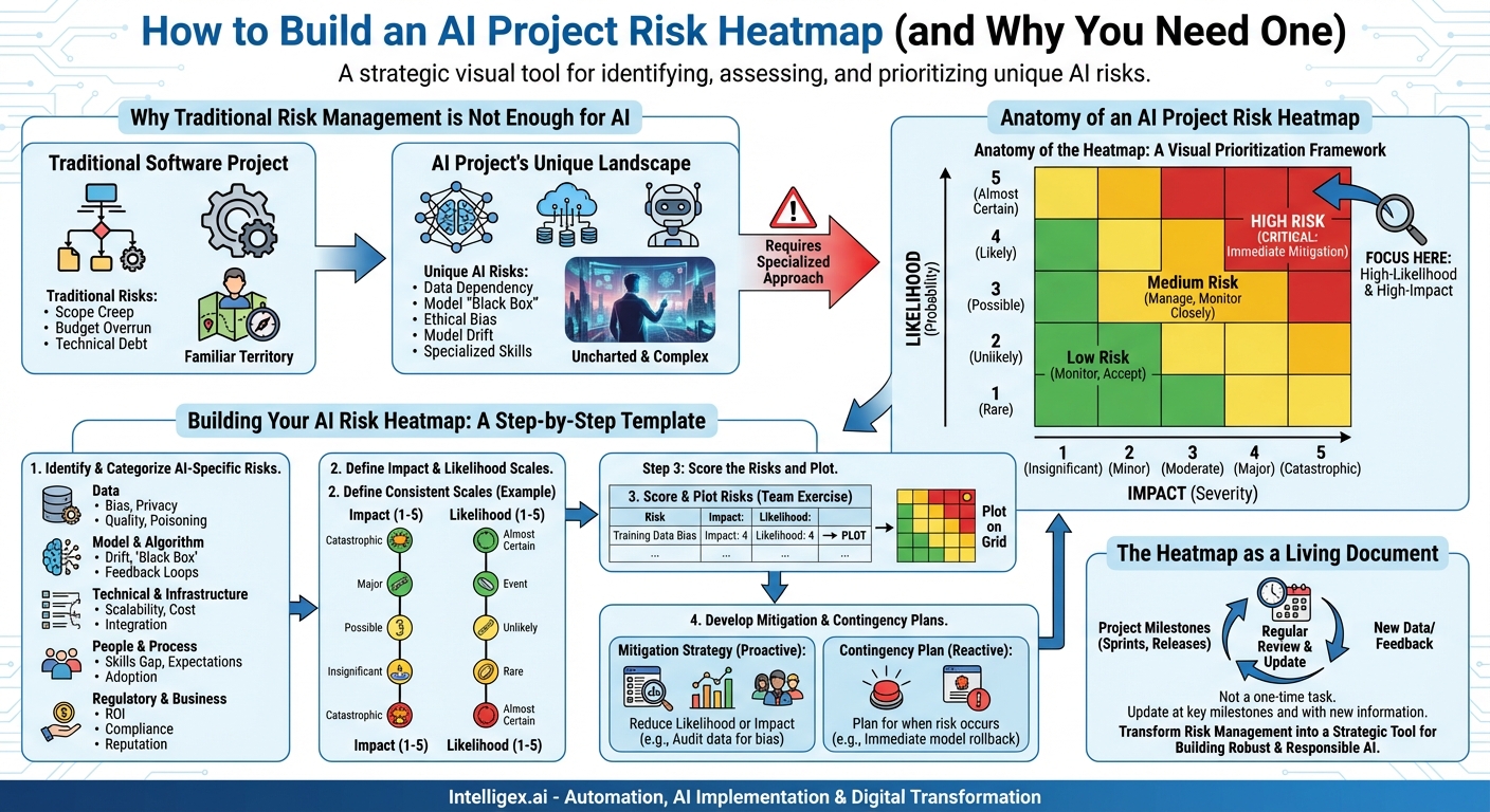 AI projects introduce complex data, model, and ethical risks that traditional frameworks often miss. To navigate these challenges, teams can use an AI Project Risk Heatmap, a powerful visual tool for identifying, assessing, and prioritizing specific threats. This guide provides a step-by-step process for creating a heatmap, transforming abstract risks into an actionable plan to ensure your AI initiatives deliver on their promise.