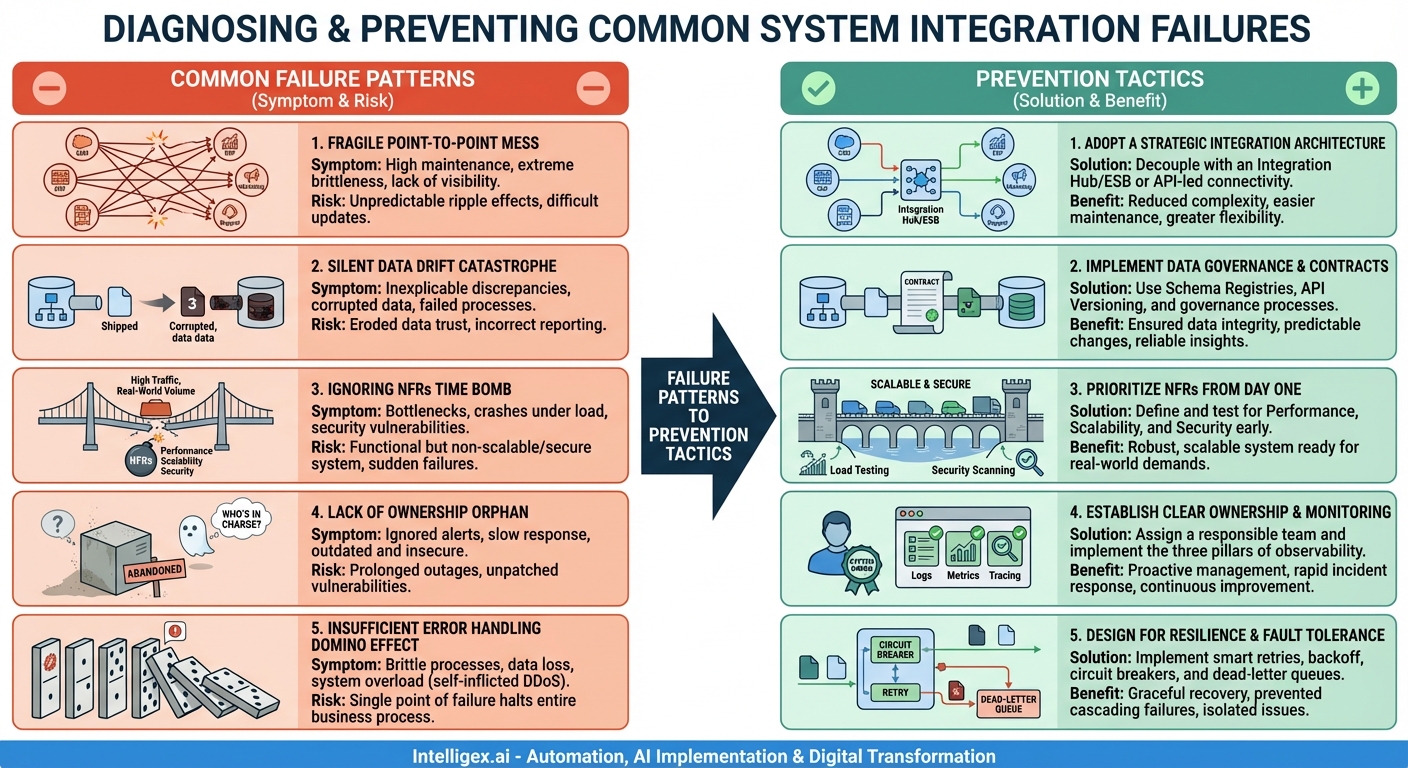Successful system integration is a discipline, not a one-off project. It requires a strategic mindset that prioritizes decoupling, governance, resilience, and ownership. By learning to recognize these common failure patterns and proactively applying these prevention tactics, you can transform your integrations from a source of fragility and risk into a powerful, scalable, and reliable engine for business growth.
