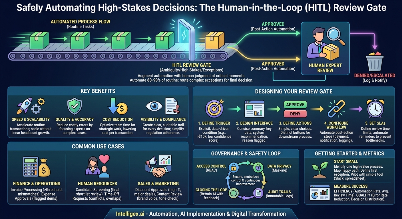 The solution isn’t to abandon automation. It’s to augment it with human judgment at precisely the right moments. A Human-in-the-Loop (HITL) Review Gate is a simple but powerful pattern for achieving this balance. It allows you to automate the vast majority of routine tasks while intelligently routing the complex, ambiguous, or high-value exceptions to the right people for a final decision. This approach combines the speed of machines with the wisdom of your expert teams, creating a system that is both efficient and safe.