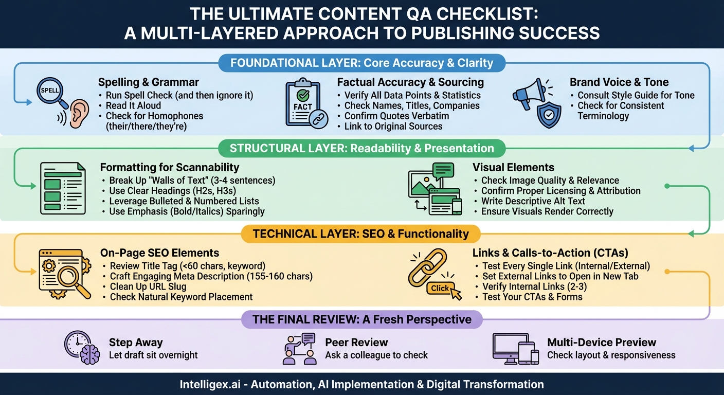 A truly effective QA process isn’t a single, monolithic step. It’s a series of layers, each focusing on a different aspect of the content. By breaking it down, you ensure no detail, from a misplaced comma to a broken CTA, slips through the cracks. We’ll approach this as three distinct layers: The Foundational Layer (accuracy and clarity), The Structural Layer (readability and flow), and The Technical Layer (SEO and functionality).