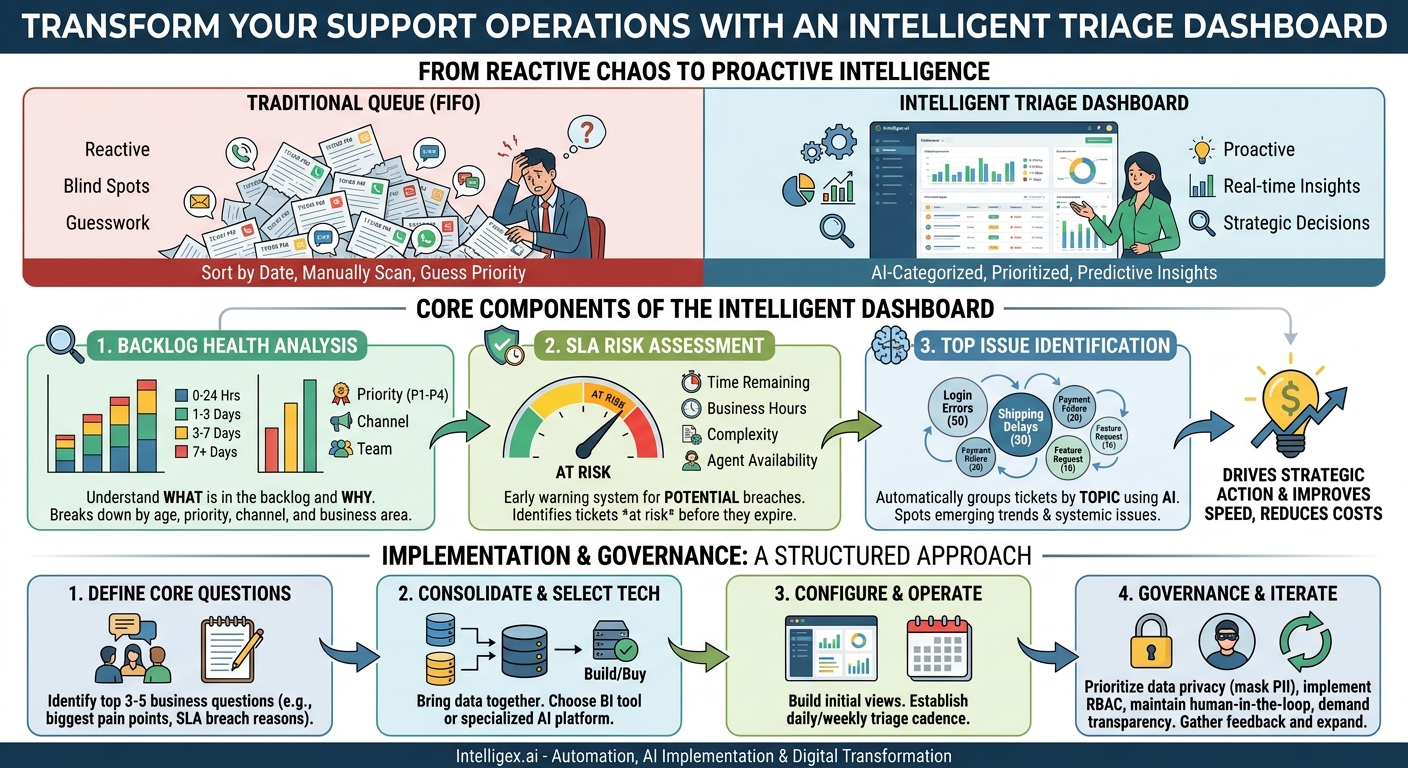 The solution isn’t just to work faster; it’s to work smarter. This requires a shift from simply managing a queue to gaining intelligence about it. A modern support triage dashboard moves beyond basic ticket counts to provide a consolidated, real-time view of three critical pillars: the health of your backlog, the risk to your Service Level Agreements (SLAs), and the top issues driving volume. This intelligence empowers you to make strategic decisions that improve speed, reduce costs, and transform your support function from a reactive cost center into a proactive source of business insight.